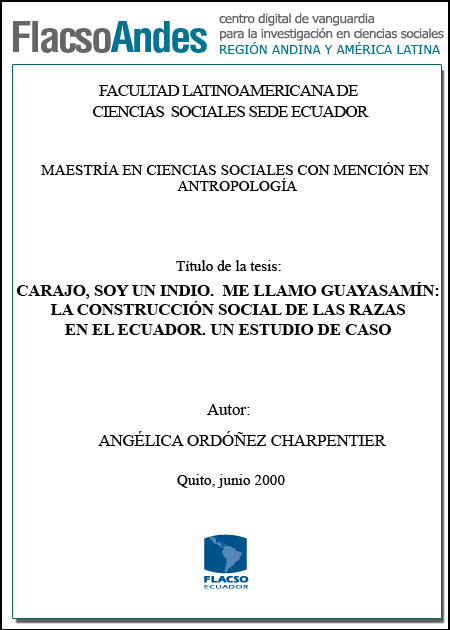 Citación : | Ordóñez Charpentier, Angélica (2000). Carajo soy un indio me llamo Guayasamín: la construcción social de las razas en el Ecuador. Un estudio de caso. Maestría en Ciencias Sociales, mención Estudios Ecuatorianos; FLACSO sede Ecuador. Quito. 136 p. |